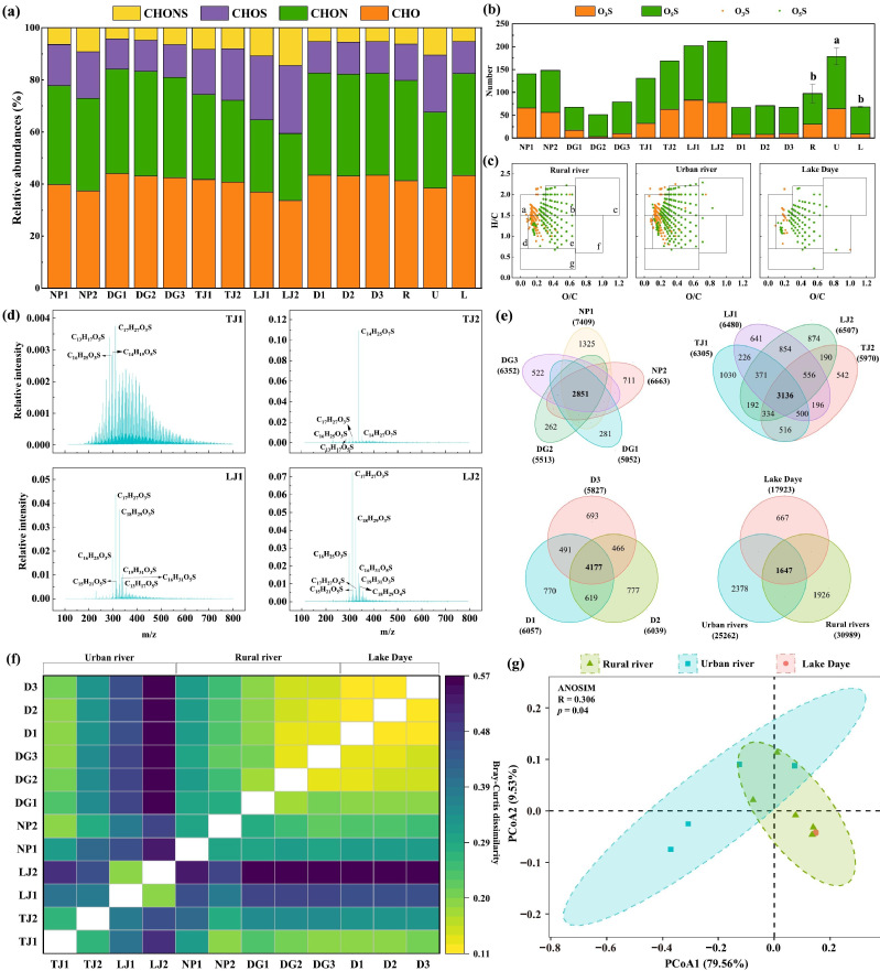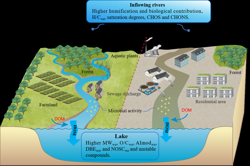 2022年夏季,长江流域遭遇了自1961年有完整气象观测记录以来最严重的干旱,正常汛期出现极低水位。汛期前的极端干旱是否会显著改变河湖连续体中的溶解性有机质(DOM)循环,目前尚不清楚。研究团队通过稳定同位素、三维荧光结合平行因子分析和傅立叶变换离子回旋共振质谱(FT-ICR MS)等手段,对汛期前极端干旱下,入湖河流与大冶湖DOM的性质和组成差异进行了探究。结果表明,大冶湖及其主要入湖河流DOM均来源于陆源,乡村河流对大冶湖陆源DOM贡献更大。荧光DOM中鉴定出2个类腐殖质组分(C1和C3)和1个类蛋白质组分(C2),其中C1和C2为主要荧光组分。与大冶湖相比,入湖河流(特别是城市河流)具有较高的氢碳比和饱和度,但具有较低的分子量、氧含量、芳香度和热力学不稳定性。微生物活动主导了大冶湖流域水生连续体中DOM的动态变化。大量的人类活动影响了入湖河流中的含硫组分,并进一步影响大冶湖DOM。与废水相关的不稳定化合物通过入湖河流输入大冶湖,城市河流的贡献尤为突出。因此,即使在极端干旱条件下的非汛期,入湖河流仍然会影响大冶湖DOM的组成和特征。该研究成果对大冶湖流域水环境管理具有指导意义。