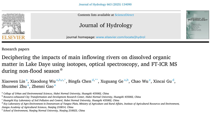 论文信息:Xiaowen Lin, Xiaodong Wu*, Bingfa Chen*, Xuguang Ge, Chao Wu, Xincai Gu, Shunmei Zhu, Zhenni Gao. Deciphering the impacts of main inflowing rivers on dissolved organic matter in Lake Daye using isotopes, optical spectroscopy, and FT-ICR MS during non-flood season [J].Journal of Hydrology,2025,134090.
