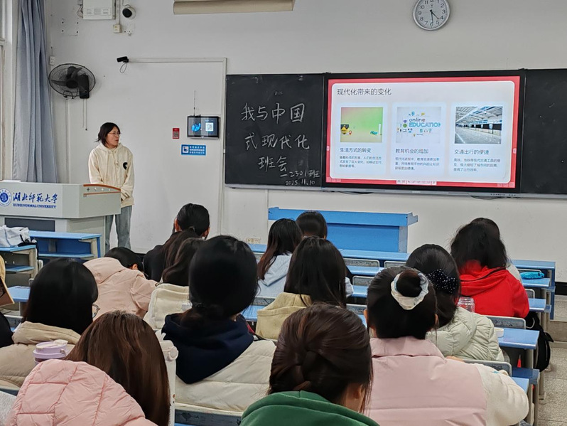 在“理论微课”环节,曾鹏艳同学结合习近平总书记关于青年工作、教育工作的重要论述,系统讲解中国式现代化的核心要义。她从“经济现代化中的高铁建设”“社会现代化里的农村城镇化”“政治现代化中的法治推进”切入,深入阐释中国式现代化“坚持社会主义道路、科技创新驱动、绿色发展、文化自信传承”四大内涵,引导同学们认识到“青年是中国式现代化建设的生力军”,并组织集体学习《总书记擘画中国式现代化新篇章》微视频片段,让理论学习更具生动性与感染力。